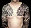 West of Japan, in Europe and the United States, we often see Japanese tattoos designs as a standalone large scale work, for example a sleeve or backpiece. However, the traditional Japanese application is one single tattoo that occupies the entire body as a suit of sorts, covering legs, arms, torso and back. In this traditional bodysuit style, a single strip of untouched skin is left visible from the collarline to the navel, made this way so the wearers tattoos are not visible in a kimono.